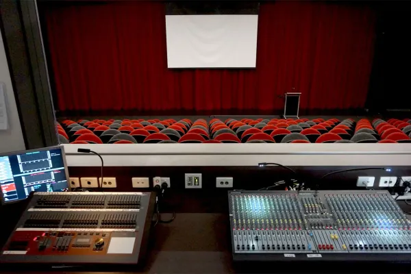 The 180” 16:9 projection screen gives a significant impact for the room when used in lectures and presentations. The ability to patch various video standards (VGA, HDMI & SDI) from stage and the the bio box allow for flexibility into the future.