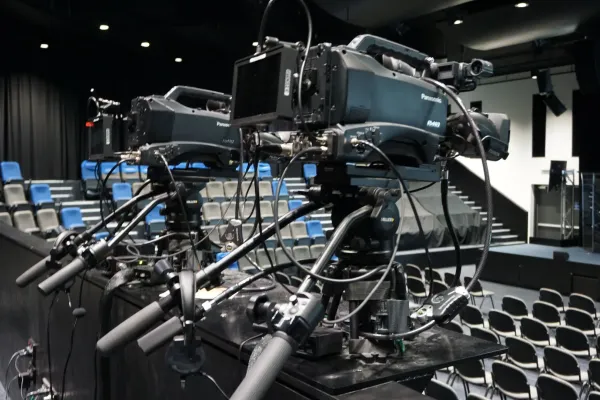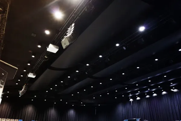 A d&b Line Array PA system with out-fill, stage lips, and subs was chosen to provide high quality sound reinforcement. The excellent acoustic treatment of the room (consisted of curved diffusors and absorptive panels) only increased the intelligibility and consistency of audio across the room. Even in the top tier, the coverage is outstanding. Complete connectivity is enabled over the whole auditorium, with links to various ancillary rooms. Sennheiser wireless microphones and in-ear monitoring systems ensure quality audio right from the start of the chain, and an Allen & Heath digital console functions as a stand-alone front of house and monitoring console (has optional Apple iOS interface for the musicians and singers to mix their own monitors).